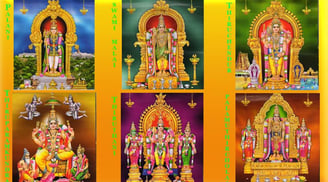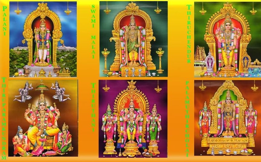 The Six Abodes of Murugan are Thiruparankundram - Arulmigu Subramaniyaswamy Temple, Tiruchendur - Arulmigu Subramanya Swami Temple, Palani - Arulmigu Dhandayuthapani Swamy Temple, Swamimalai - Arulmigu Swaminatha Swamy Temple, Tiruttani - Arulmigu Subramanyaswamy Temple, Pazhamudircholai - Arulmigu Solaimalai Murugan Temple.